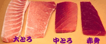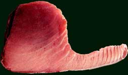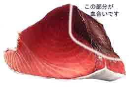 色 | 色で鮮度、捕れた所を判断します。 色がくすんでいるボケていると云うことは死んでから水揚げされたもの(苦しんで死んだ物、死んでから長く水に浸かっていたことになります)冷凍状態の悪い物その為に、肉質は柔らかくなってしまいます。それが色に良く表れます。 活きて水揚げされた鮪でも冷凍が悪いと色が落ちます。 ポイントはまず色が鮮やかであること赤身の色左記のように赤につやが有りきれいで透明感が有るか判断して下さい。 これで弾力の有る鮮度の良いものは買えるはず! 鮪は、触ってみて羊羹のような肌触りの物がうまい。 (ネトッとすいつくような感じ) スーパーや大型店で買うときはご自分の手のひらの色を外で見ておいて鮪の並んでいるショーケースの中に手を入れて見ればよくわかります。手のひらの色はかなり違がうと実感するでしょう。鮪をケースから出してみるのも効果的です。ご家庭の食卓の蛍光灯もパルックなど気を使われるとおいしく召し上がれます。 脂は切った切り口をよく見ると判ります。切り口は魚を胴切りした面です。(左の写真のように)縦切りを見てもよく判りません。 |